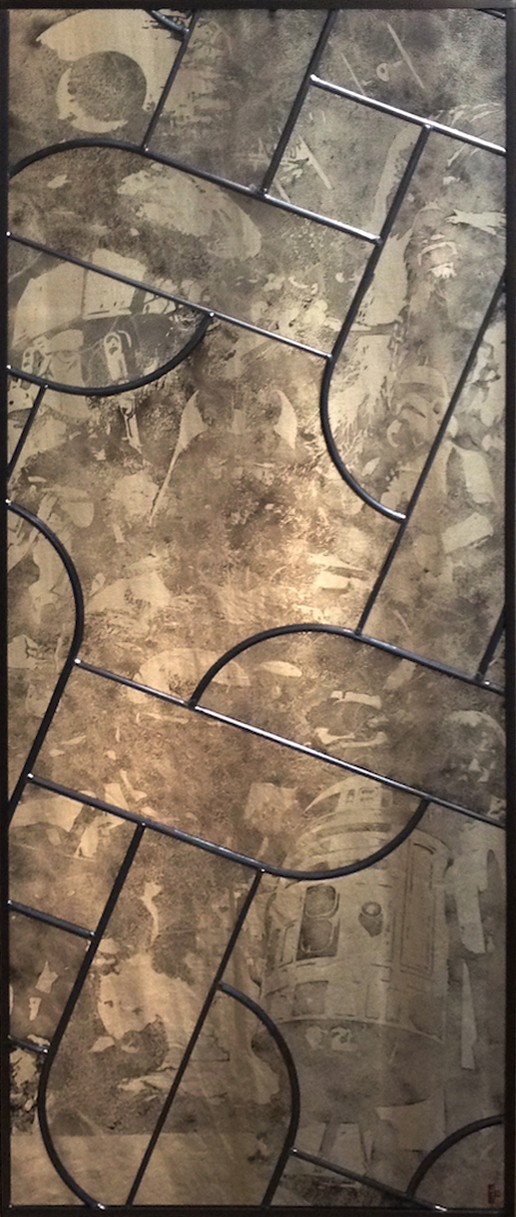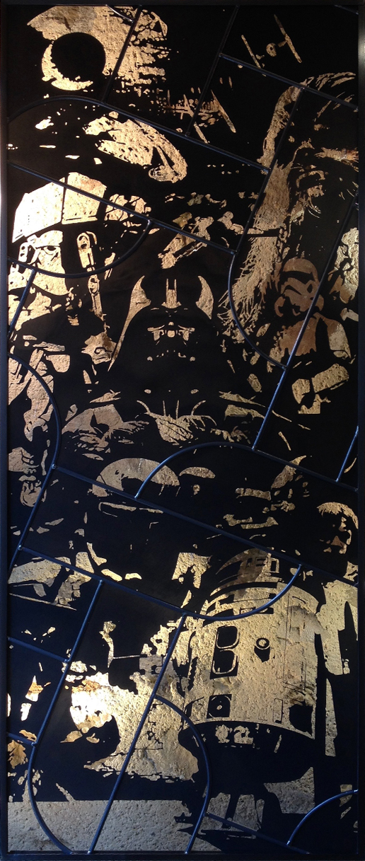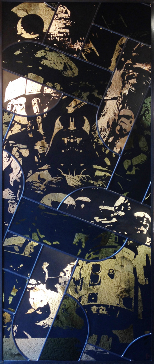 Le vitrail de Star Wars représente l’alchimie intérieure que chaque antagoniste traverse et vie durant la saga. Chaque personnage du vitrail nécessite une longue recherche iconographique et plusieurs essais visuels avant de prétendre à un équilibre dans la composition que je cherche à dévoiler par la transparence et l’opacité. Un seul ne figure pas encore, mais sera bientôt présent par une application de feuille d’or qui symbolise immortalité, conscience, sagesse et vérité.